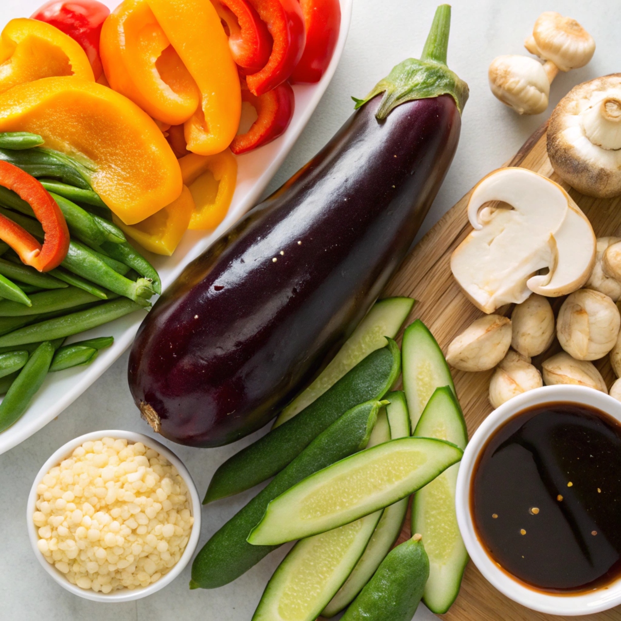 Fresh ingredients ready to be cooked into a flavorful eggplant stir-fry